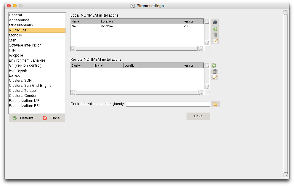 首先是将Pirana与NONMEM关联,选择File\Settings\NONMEM,如下图所示。点击Local NONMEM installations栏目右上角的搜索按钮,让Pirana自动搜索或手动指定NONMEM的安装路径。